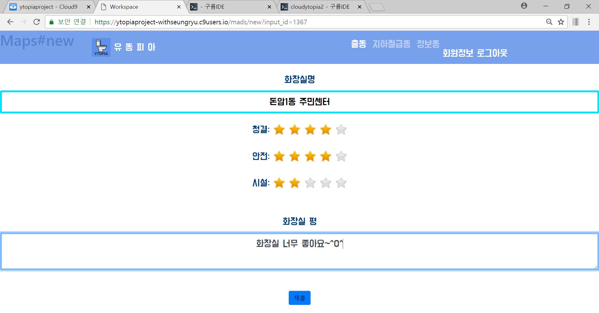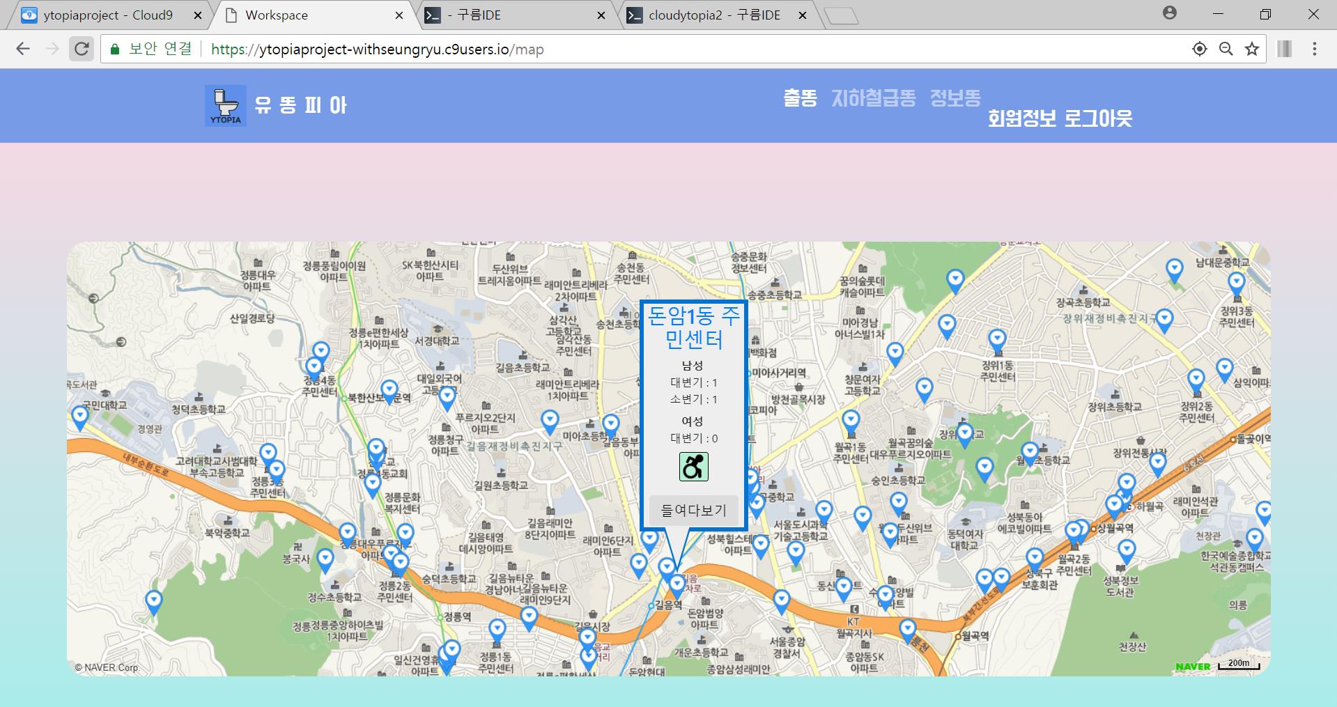 1. 개발을 할 때는 힘들지 않았지만, 서비스에 사용될 데이터를 모으는데 많이 힘들었습니다. 그 당시 서울시 공공데이터 사이트에 공용화장실에 관련해서 데이터가 있었습니다. 하지만 그 당시 데이터에 정확성에 문제가 있었습니다. 데이터 정확성의 조사를 위해 직접 가보면 있지 않은 화장실이었으며, 있다 해도 위생상에도 많은 문제가 있었습니다. 그래서 공공데이터에 의존하기보다는 직접 발로 뛰며 데이터를 수집하려 했지만 정보가 많이 있지 않는 공용화장실이었기 때문에 많이 힘들었었습니다. 처음에는 서울시내의 모든 화장실을 조사하리라 마음을 먹었었지만, 결국 안암동 주변의 화장실로 범위를 좁혀야만 했었습니다.