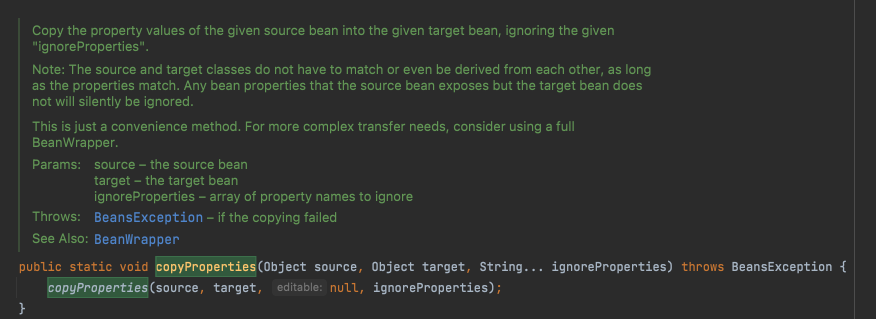 ๋ํ copyProperties ์ค ํ๋์ overloadingํ ๋ฉ์๋๋ก ํ๋ก์ ๊ฐ์ฒด๋ฅผ ๊ฐ์ง ๋ณ์๋ฅผ ๊ฐ์ฒด ๋ณต์ฌ์์ ์ ์ธ์์ผ์ค ์ ์๋๋ฐ,