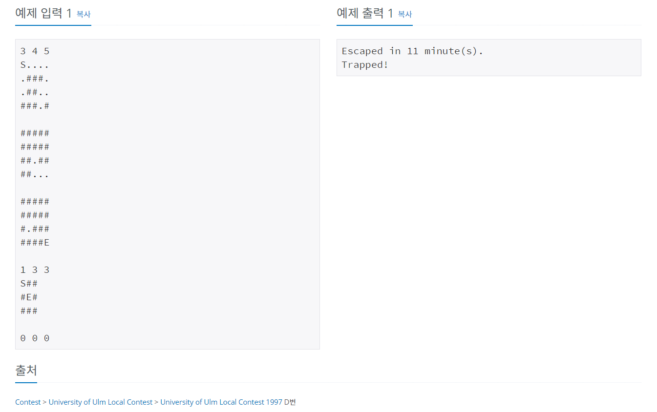 이번 상범 빌딩 문제는 행렬에서 너비우선탐색(BFS)을 이용해 시작점에서 각 위치의 거리만 구할 수 있으면 쉽게 풀 수 있다.