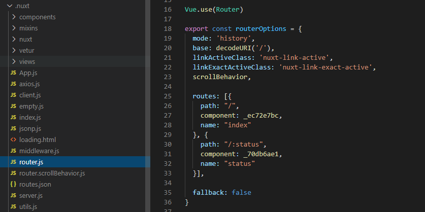 만들고 난 후 .nuxt/router.js 에서 /:status로 동적 라우트가 생성됨을 확인할 수 있습니다.