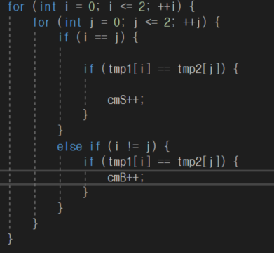Strike는 각 자리에 맞아야하며, 두 숫자가 동일해야하고, Ball은 각 자리가 틀려야하며 두 숫자가 동일해야하므로 그에 맞게 조건문을 맞혀주었다.