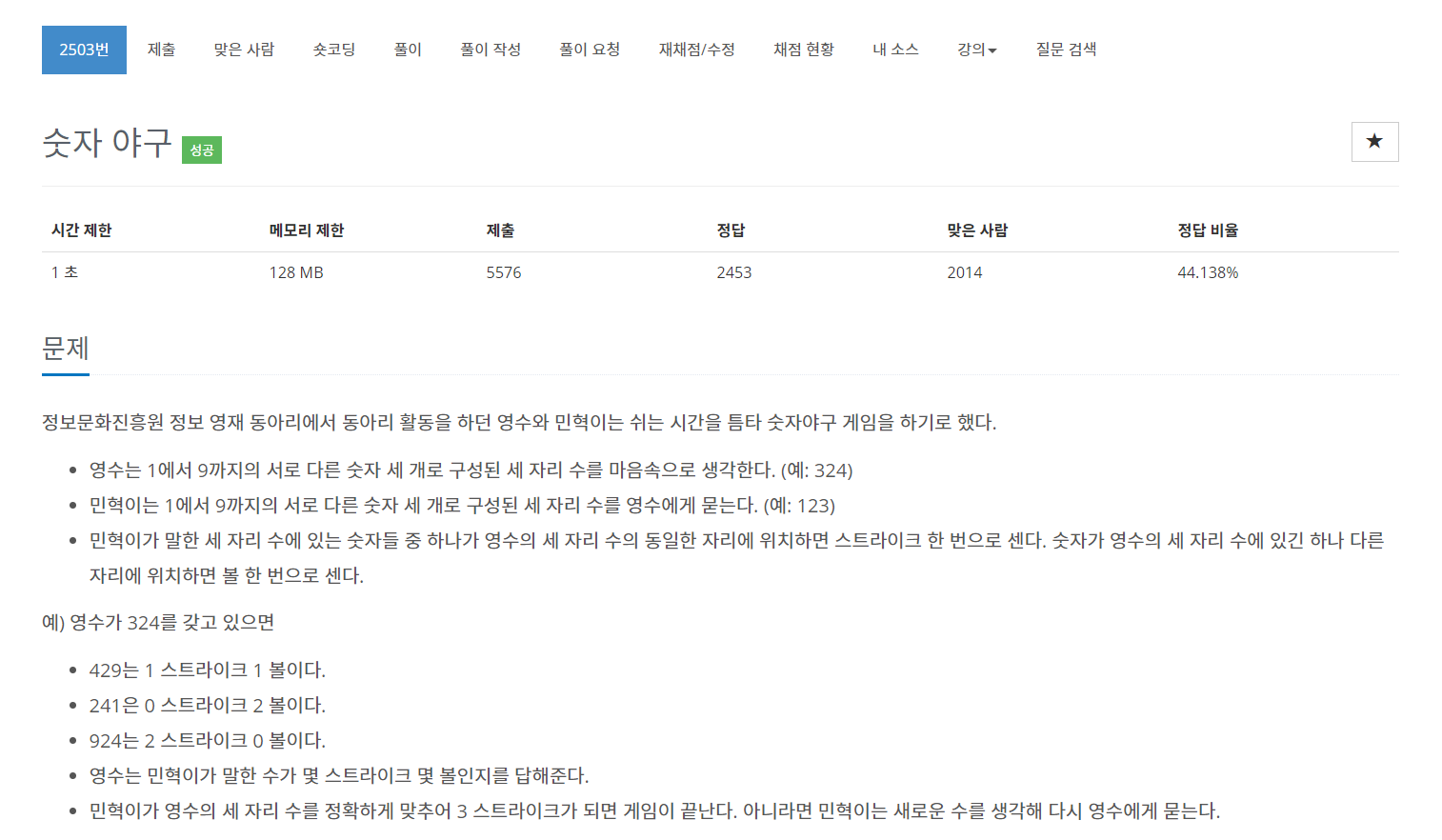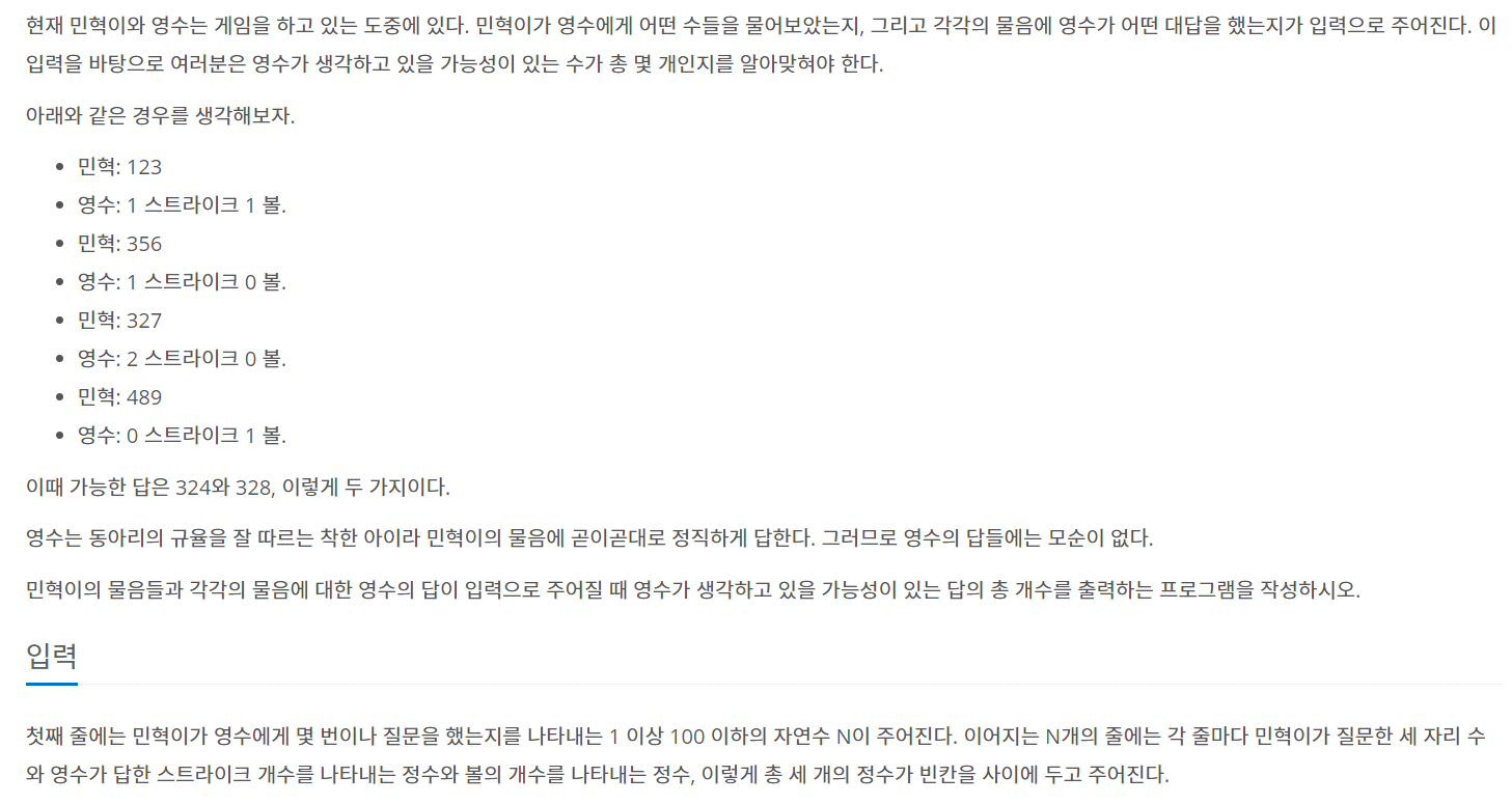 숫자 야구라는 타이틀만 보고 우리가 종종 해오던 쉬운 게임이라 생각하고 문제를 읽었더니, 알고리즘으로 짜기에는 복잡해보였다. 먼저 1~9의 숫자 중에서 선택을 해야했기 때문에 3자리 숫자 중 각 숫자에 맞게 겹치는 숫자들이 없어야하며, 0도 포함해서는 안됐었다.