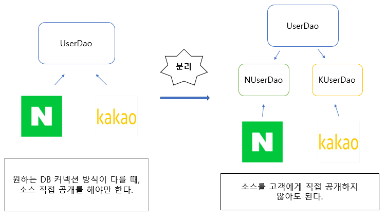 ์๋ฅผ ๋ค์ด Naver์ Kakao๊ฐ Dao ๊ฐ์ฒด๋ฅผ ์ฌ๊ณ ์ถ์ดํ ๋, DB ์์ฑ ๋ฐฉ์์ ์์ ๋ค์ ๋ฐฉ์์ผ๋ก ์ฌ์ฉํ๊ณ ์ถ์ดํ๊ธฐ ๋๋ฌธ์,